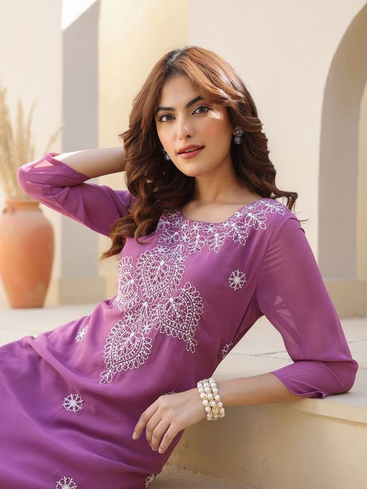 Lavender Georgette Thread Embroidered Straight Punjabi Kurta \ Only Top [ Export Quality ]