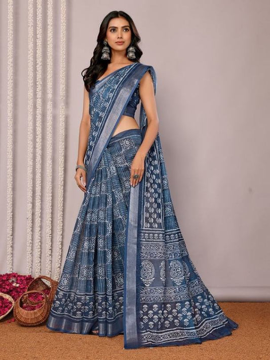 Indigo Blue Cotton Blend Block Print Saree With Attached Blouse Piece [ Export Quality ]