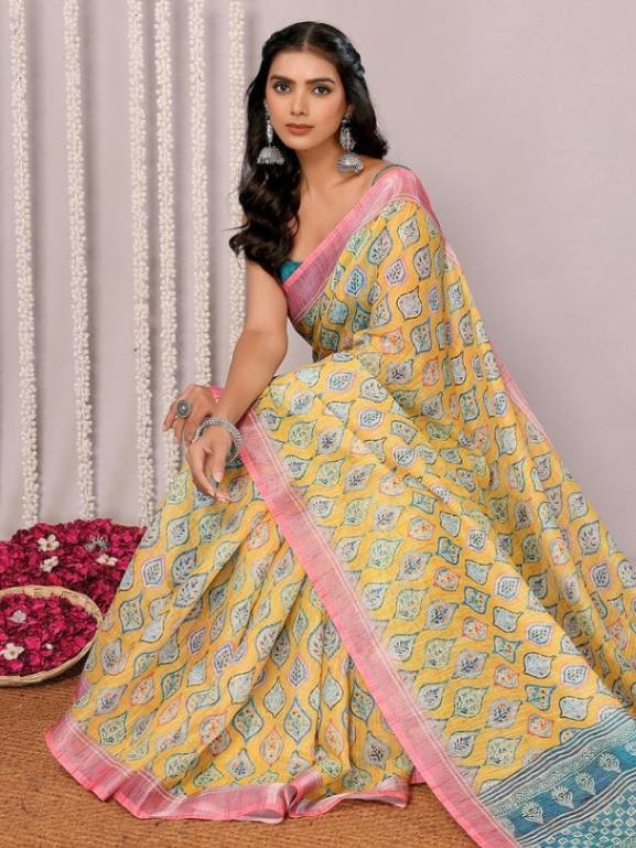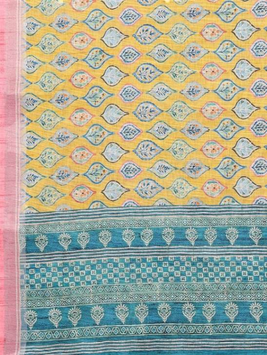 - Color: Yellow with teal and white prints, pink border, teal pallu